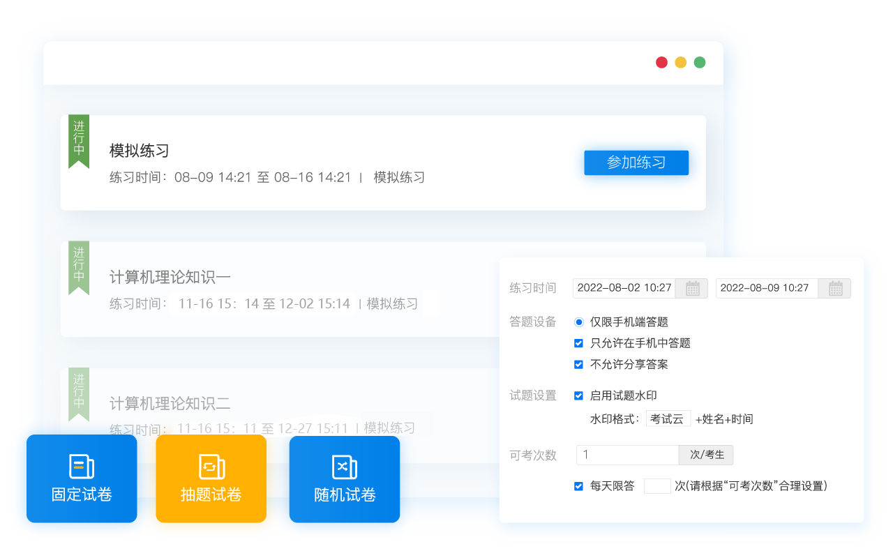支持固定試題練習(xí)、隨機(jī)練習(xí)、抽題練習(xí),靈活設(shè)置